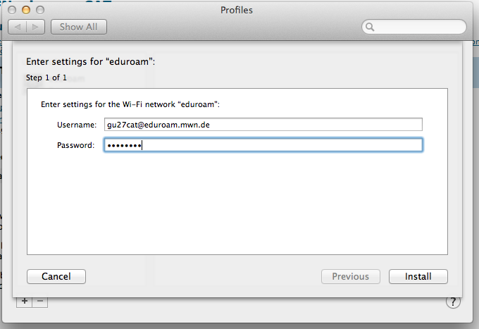 Enter your user credentials as shown: TUM-ID@eduroam.mwn.de, e.g. gu27cat@eduroam.mwn.de.