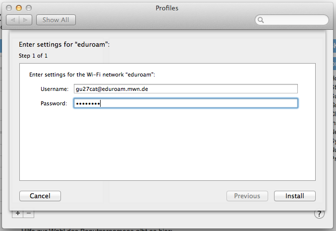 Enter your user credentials as shown: TUM-ID@eduroam.mwn.de, e.g. gu27cat@eduroam.mwn.de.