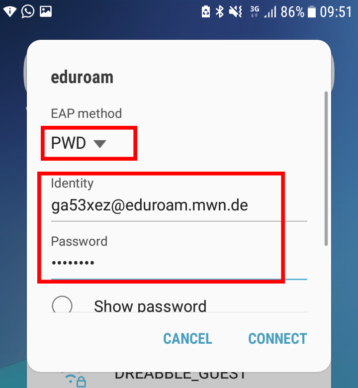 Enter your user credentials as shown: TUM-ID@eduroam.mwn.de, e.g. gu53xez@eduroam.mwn.de and your personal password.
