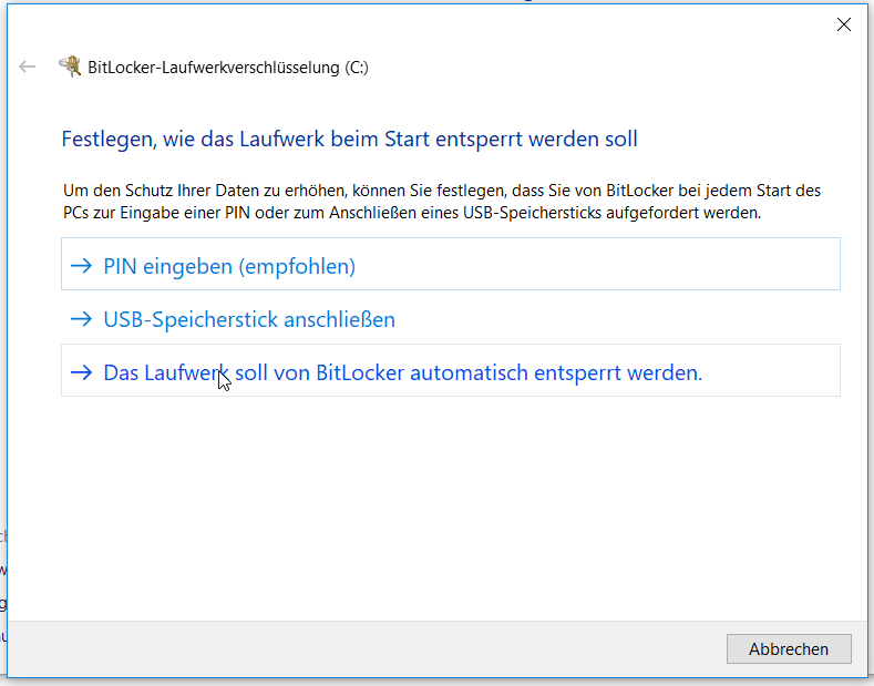 Sofern kein extrem hoher Schutzbedarf besteht und der Rechner ein TPM zum Speichern des Verschlüsselungskeys besitzt, kann die Option mit der automatischen Entsperrung genutzt werden. Dann bemerkt der Nutzer nicht einmal, dass Bitlocker im Hintergrund die Festplatte absichert.