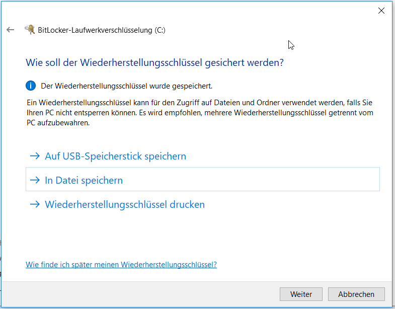 Einen kritischen Punkt gibt es beim Einsatz der Festplattenverschlüsselung zu bedenken: Bei einem defekten Notebook soll natürlich kein Datenverlust entstehen und die Festplatte in einem Austauschnotebook wieder gelesen werden können. Für diesen Fall erzeugt Bitlocker bei der Installation einen Notfallschlüssel, den man in eine Datei speichern oder ausdrucken kann.