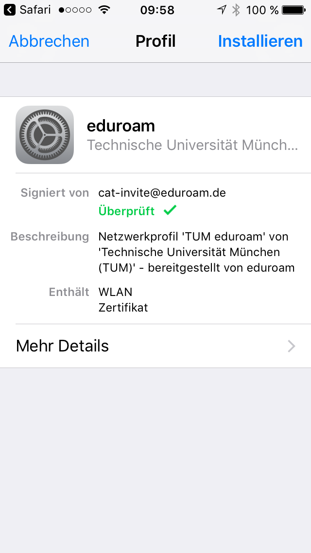 Installieren Sie das Ihnen angezeigte Konfigurationsprofil mit einem Klick auf "Installieren".