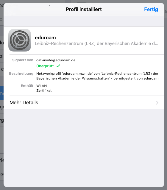 Klicken Sie auf "Fertig", um das Profil endgültig zu installieren. Ihr Gerät sollte sich automatisch mit dem eduroam verbinden.
