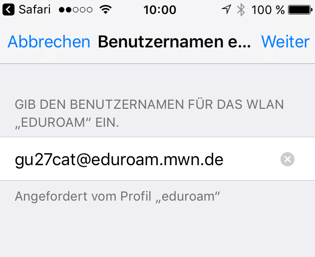 Tragen Sie Ihren Benutzernamen nach dem Muster TUM-Kennung@eduroam.mwn.de, z.B. gu27cat@eduroam.mwn.de ein.