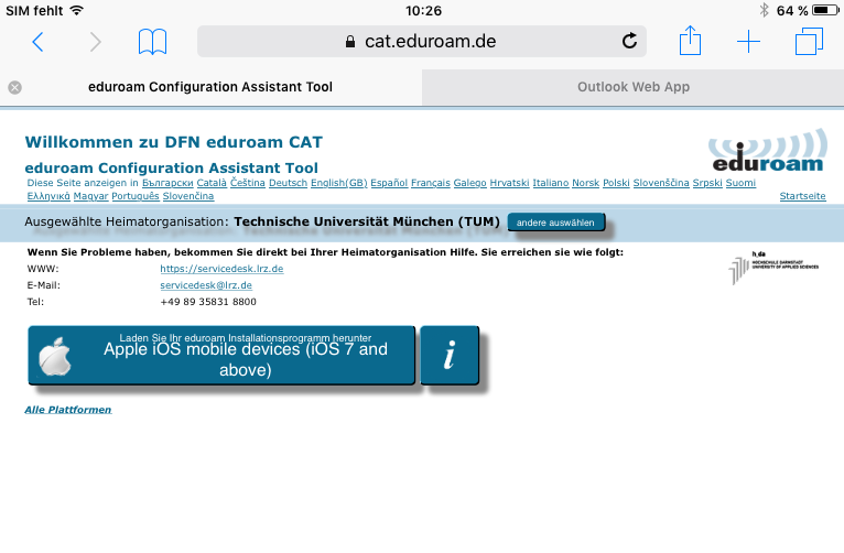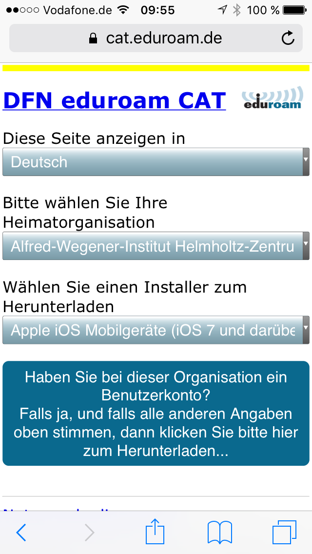 Unter https://cat.eduroam.org/ starten Sie das Herunterladen des Konfigurationsprofils mit einem Klick auf den Button "Laden Sie Ihr eduroam Installationsprogramm hier herunter".