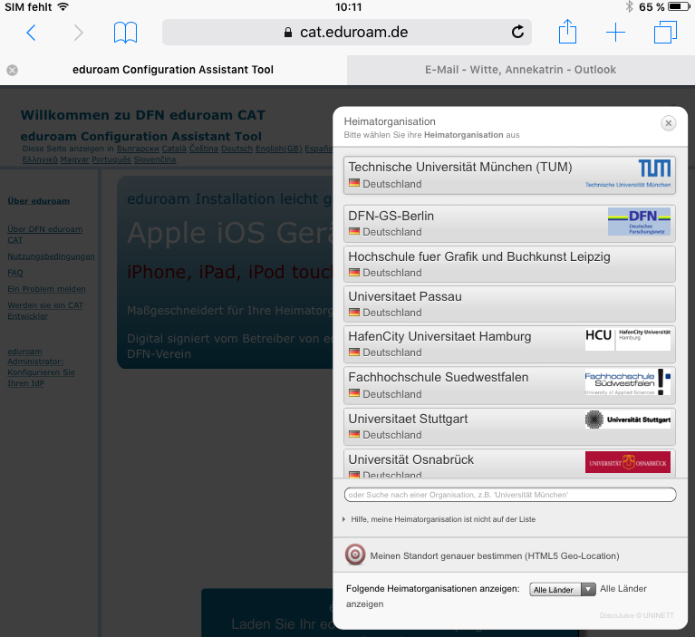 Screenshot: Auswahl "Heimatorganisation" Ansicht iPad