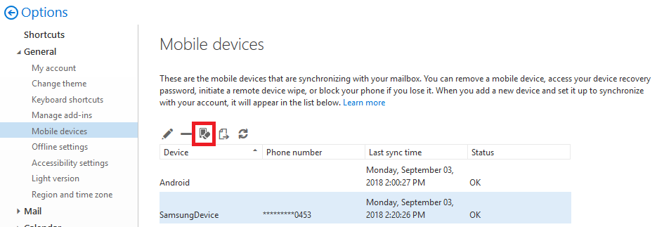 You can activate a device reset by logging in with your TUM ID under https://mail.tum.de and then by selecting "Options > General > Mobile Devices" in the upper right of the page. Highlight the device and click on the erasure symbol "Wipe all data":