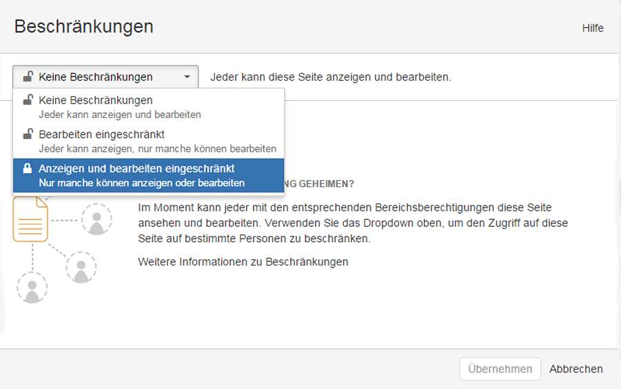Schritt 3: Sie gelangen zum Fenster "Beschränkungen". Hier stehen Ihnen drei Berechtigungsstufen aus nachfolgender Abbildung zur Verfügung. Wählen Sie im Dropdown-Menü die gewünschte Option.
