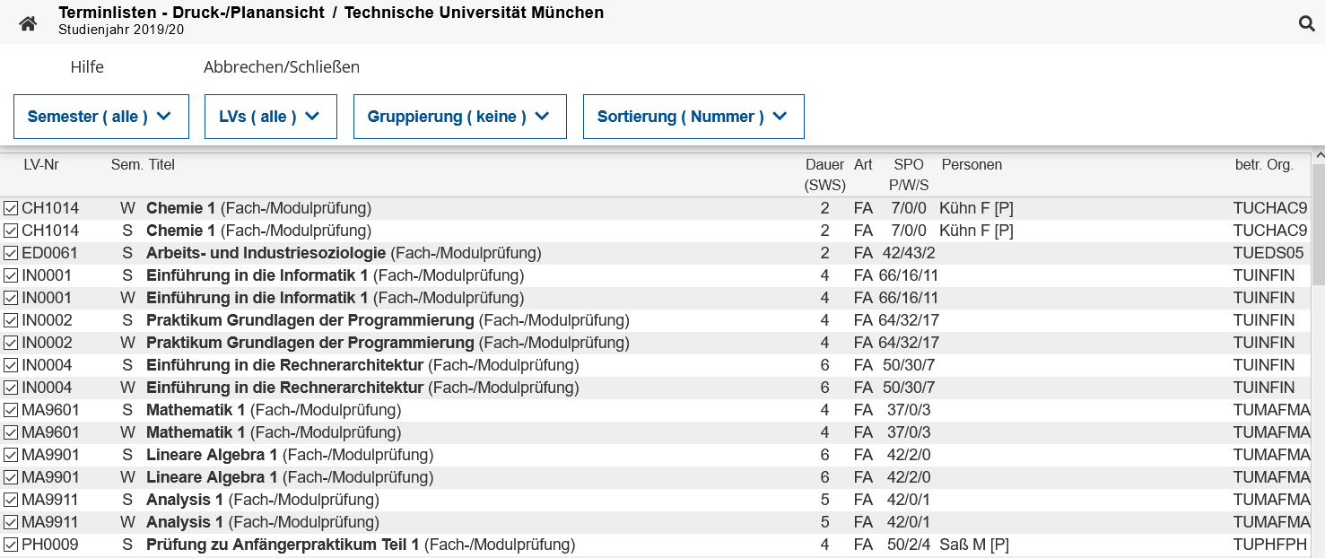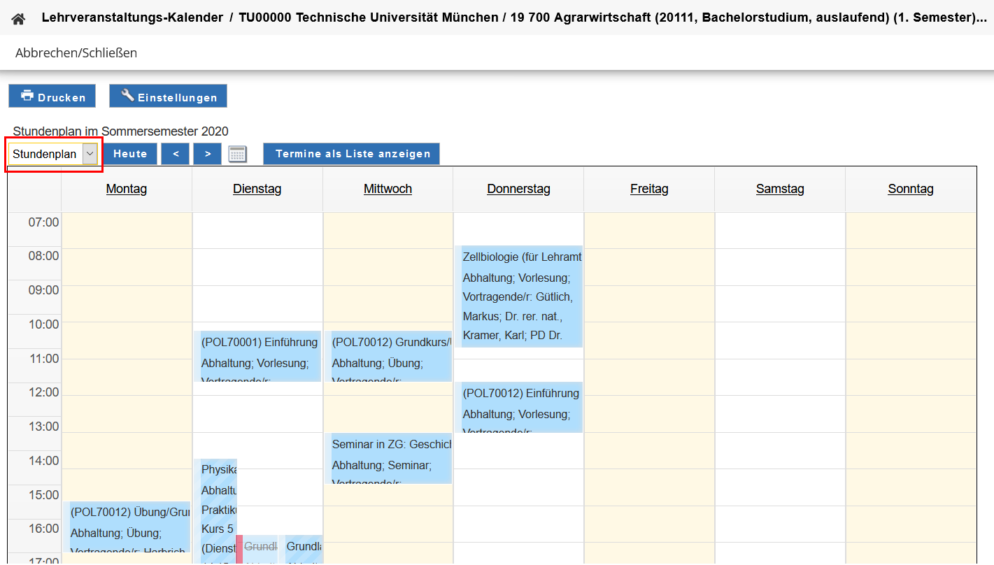 Alle Lehrveranstaltungen und Prüfungen, für die Sie sich angemeldet haben oder angemeldet wurden, sehen Sie in Ihrem Terminkalender in TUMonline.