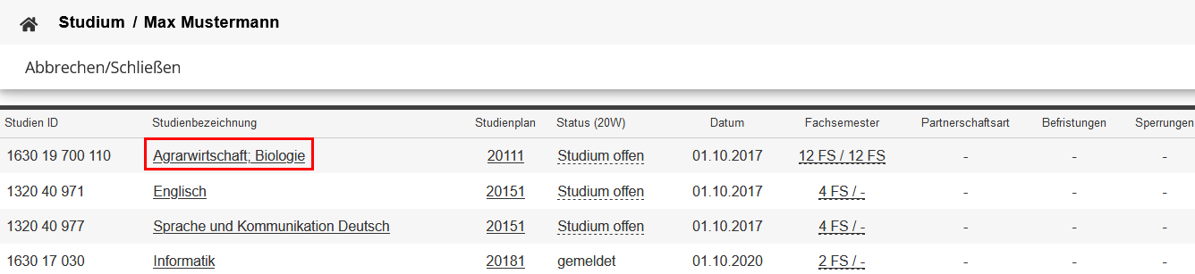 Klicken Sie auf der nächsten Seite auf den Titel Ihres Studiengangs (Studienbezeichnung):