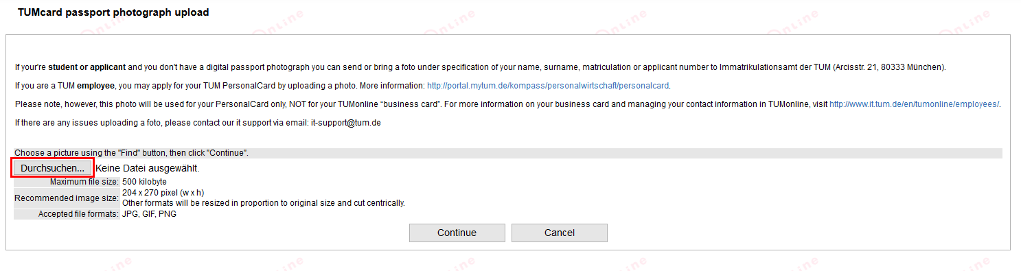 Screenshot: Application “TUMcard Passport Photograph Upload”