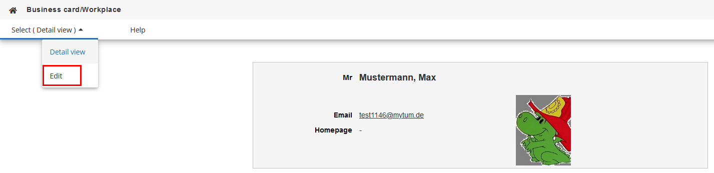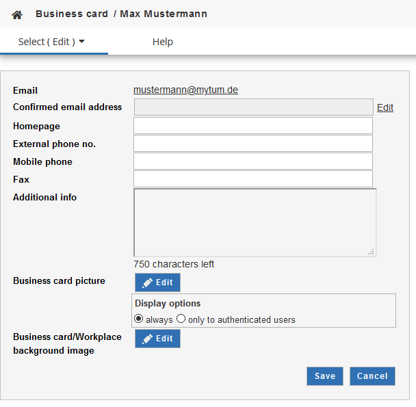 “Business card picture” | Here you can upload a photo for your business card. To do so, click on the “Edit” button. Click on “Browse” to select an image which is already saved on your computer. The image should be formatted according to the information given on the right. In addition, under “display option” you can choose whether the image should be displayed to all users or only registered TUMonline users. |