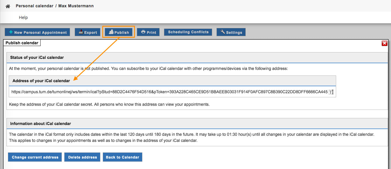 If you click on the “Publish” button in your personal calendar you will receive an iCal link. You can test the functionality of subscribing to the calendar in other programs by accessing the iCal link and opening it e.g. with an editor or a local desktop calendar program (iCal, Sunbird...). You should see your appointments there.