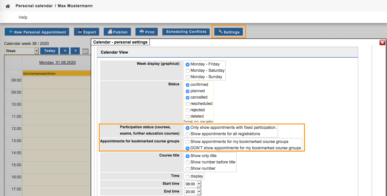 Please note that the calendar settings affect the individual display of all calendars in TUMonline.