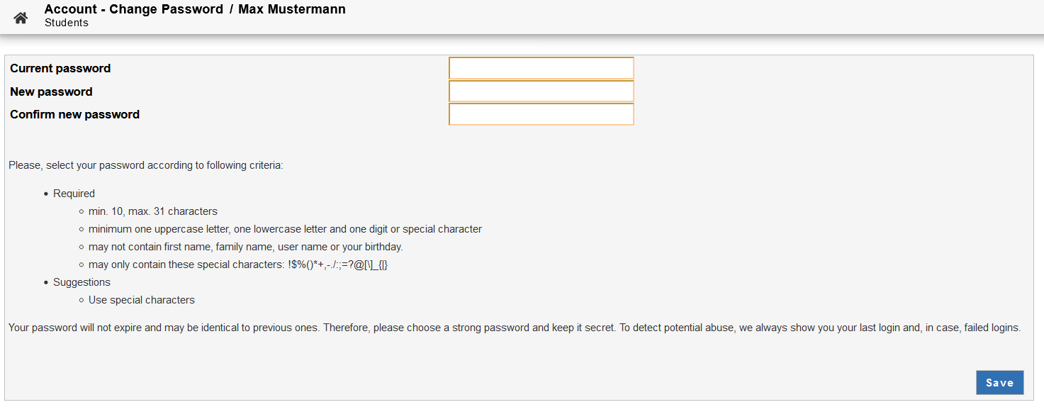 Please enter the new password twice, according to the criteria listed below the entry fields, and confirm with “Save”.