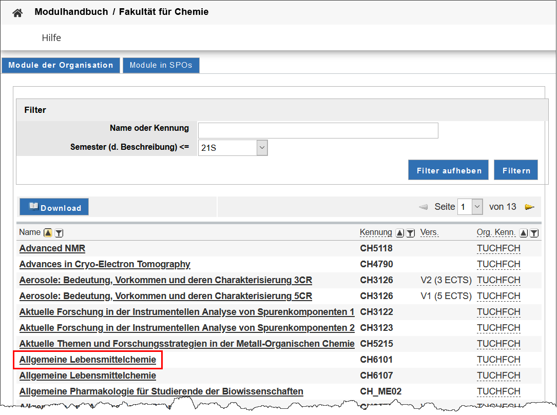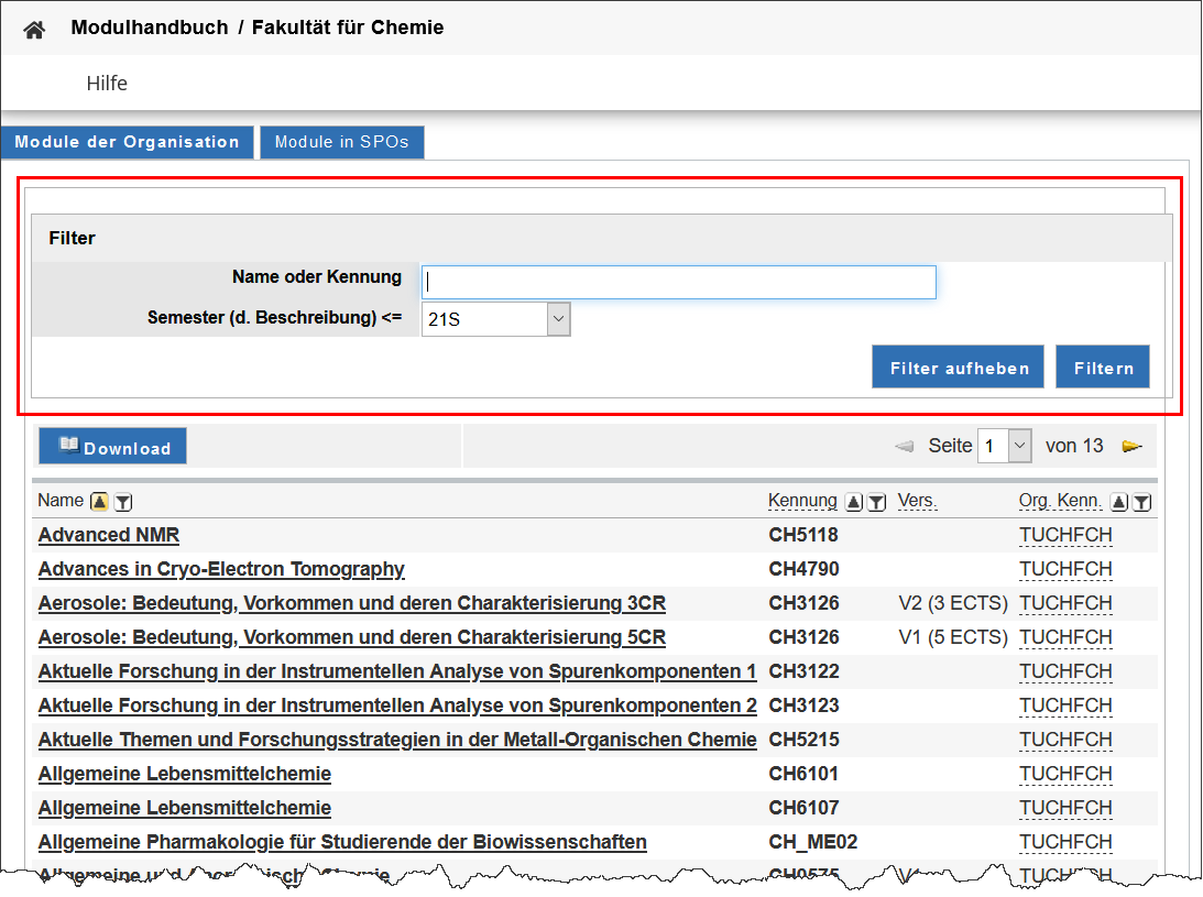 Beispiel 2: „Fakultät für Chemie“ als Organisation ist gewählt: Sie können nach allen Modulen dieser Fakultät suchen.
