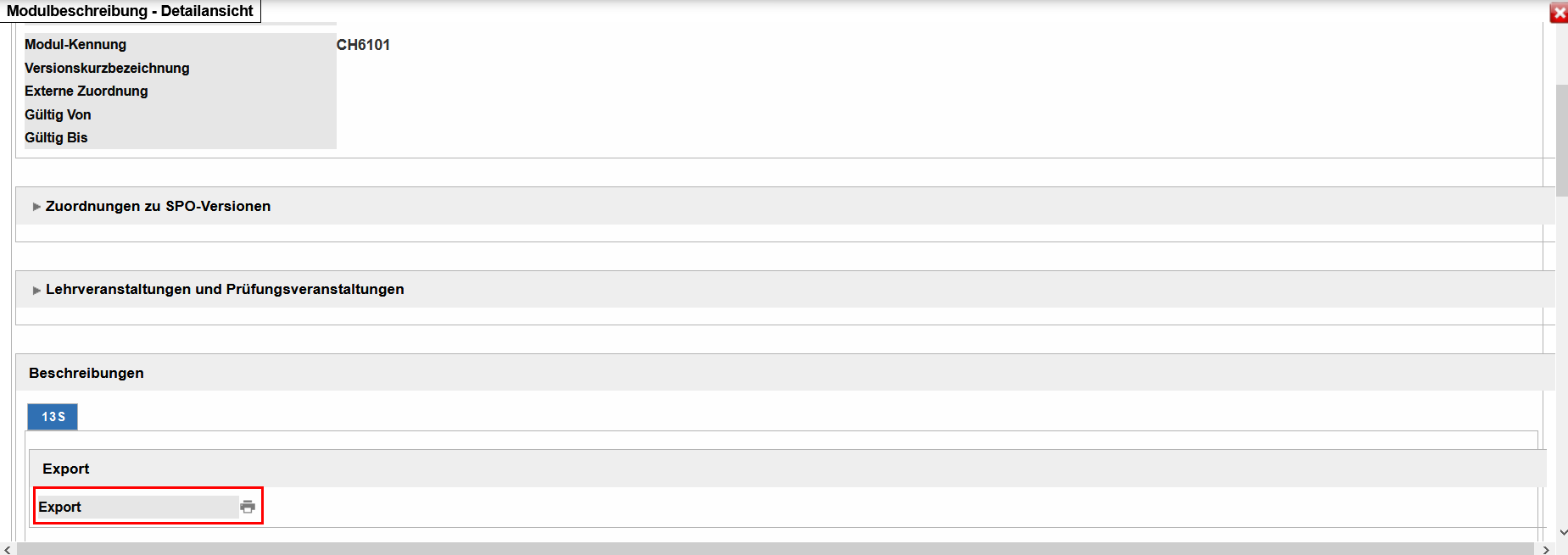 Die Seite „Modulbeschreibung - Detailansicht“ öffnet sich. Klicken Sie unter dem Bereich „Beschreibungen - Export“ auf das Drucker-Symbol, um sich die Modulbeschreibung im Druckformat herunterzuladen: