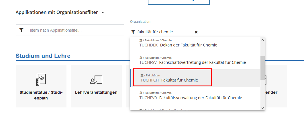 Filtern Sie auf der Startseite auf die betreffende Organisation (TUM/Fakultät/Lehrstuhl/...):