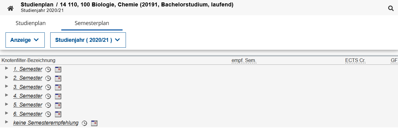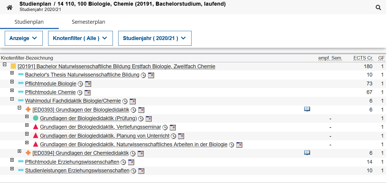 Das Studienangebot zeigt die allgemein gültige Version des Studienplans für einen Studiengang an - im Unterschied zu der für einen immatrikulierten Studierenden personalisierten Version des Studienplans in seinem Curriculum Support. Auch im Studienangebot lässt sich vom Studienplan auf die Semesterplanansicht umschalten.