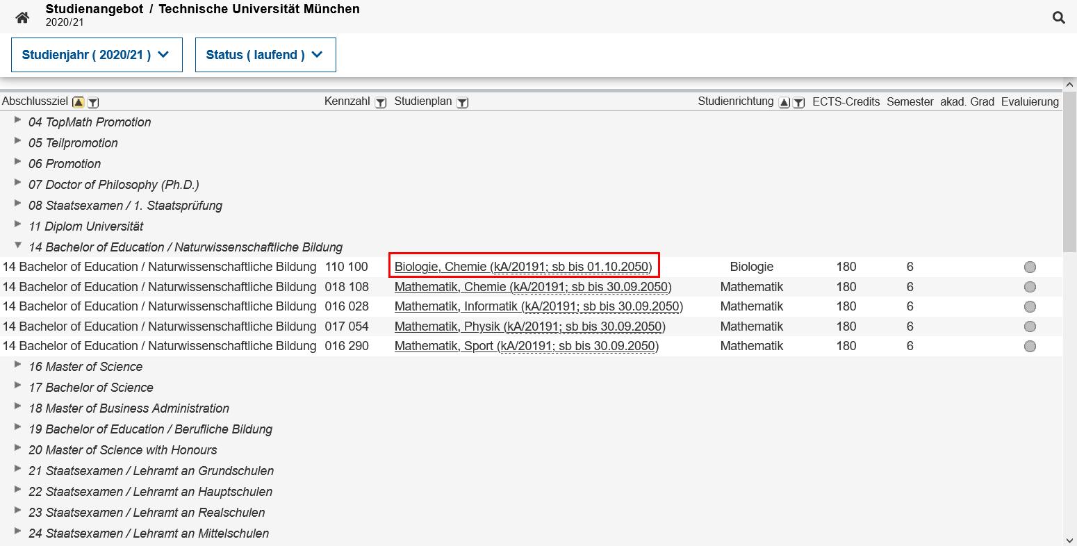 Eine Liste der an dieser Organisation angebotenen Abschlussziele öffnet sich: