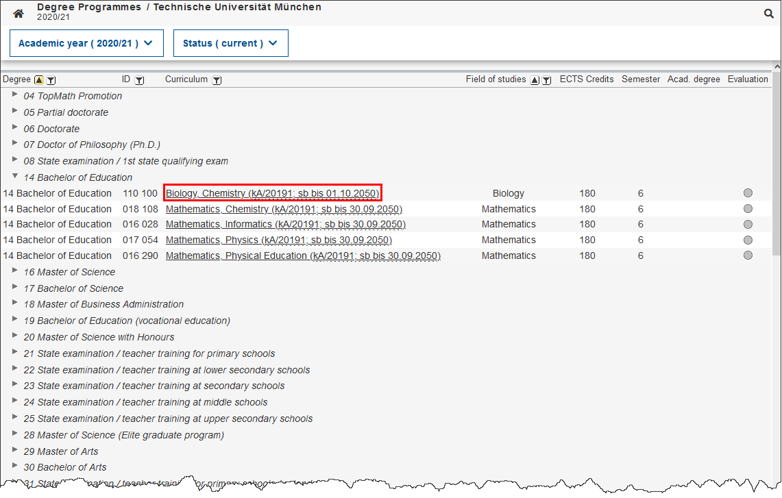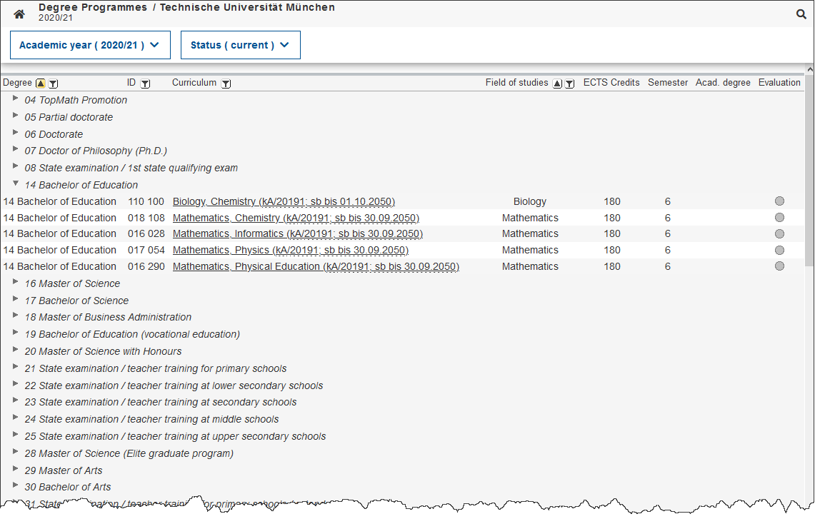 Screenshot: Display of degree programs
