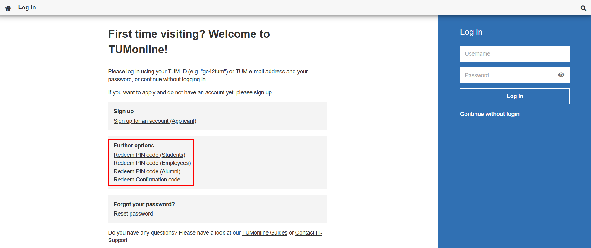 Students: You can obtain a PIN code from IT support (it-support@tum.de) or by clicking on the “Reset password” link on the TUMonline login page.