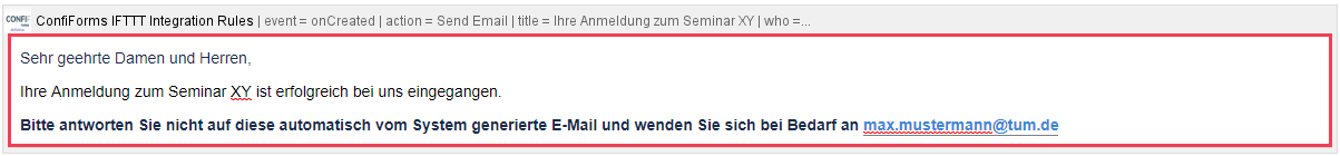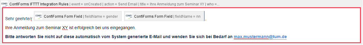 Ist das ConfiForms IFTTT Makro gemäß obigem Schritt 1) konfiguriert und eingefügt, folgt nun der E-Mailinhalt.