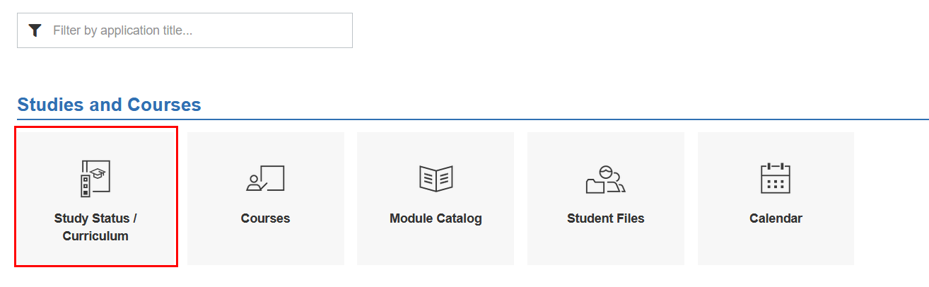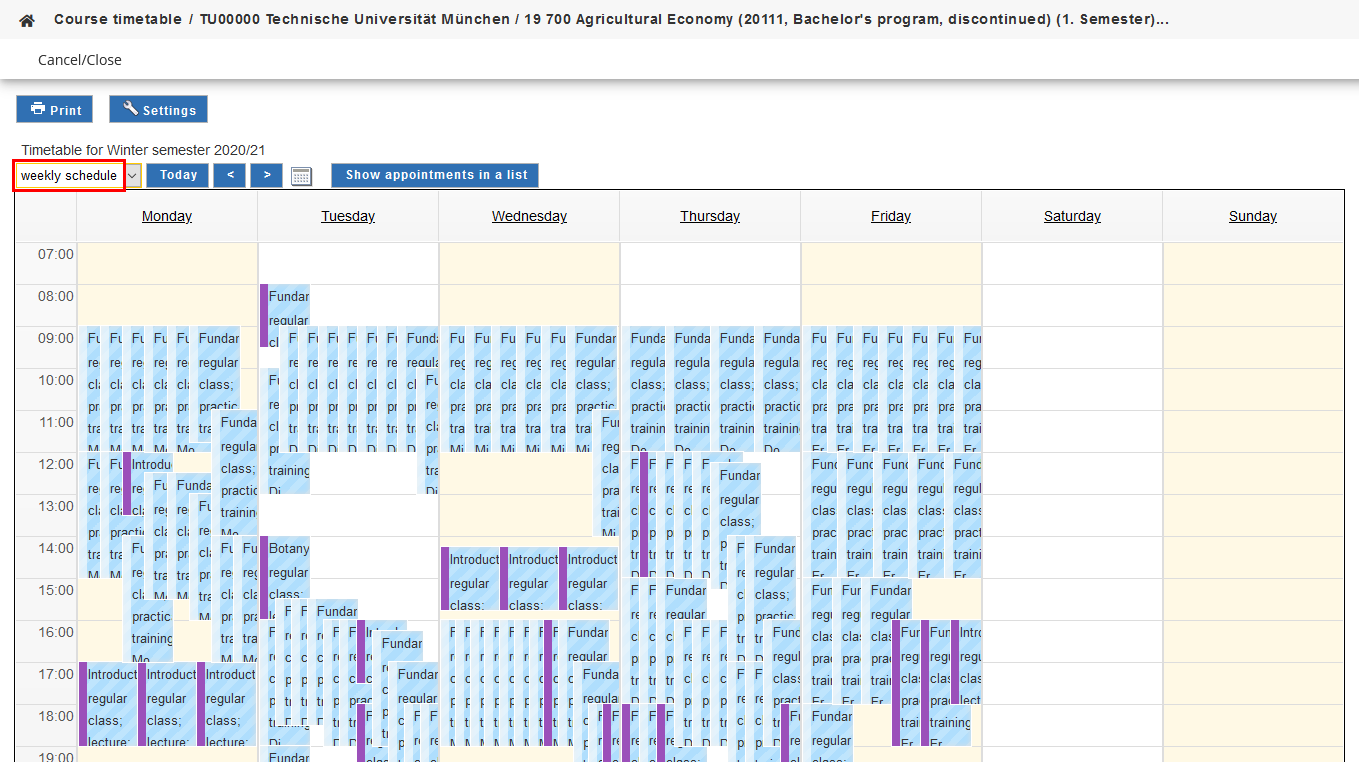 Click on the application “Study Status / Curriculum” and then on the calendar icon in order to open the calendar view. In the calendar view (timetable view) you can switch from the weekly calendar to a timetable view. The latter only displays appointment series recurring weekly for at least two weeks and no single events. You can also customize the display of the week days and hours in your personal calendar.