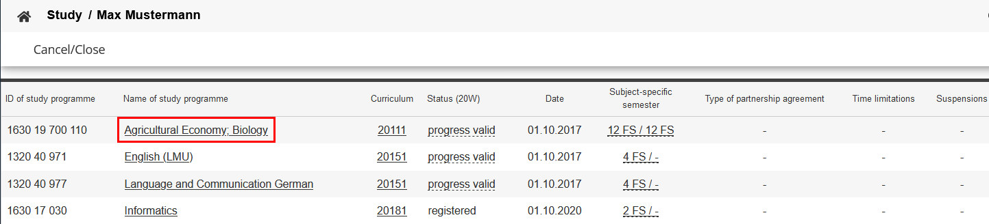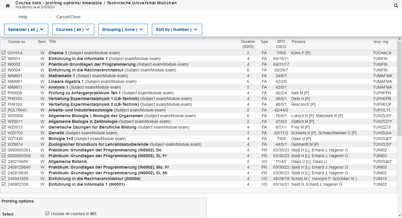 By clicking on “Semester (all)” you can filter the list in order to view only course dates taking place in the winter semester or the summer semester. If you are only interested in exam dates, click on “Courses (all)” and select virtual courses in order to exclude all scheduled dates (real courses). You can also select only real courses for a display of scheduled dates and no exam dates.
