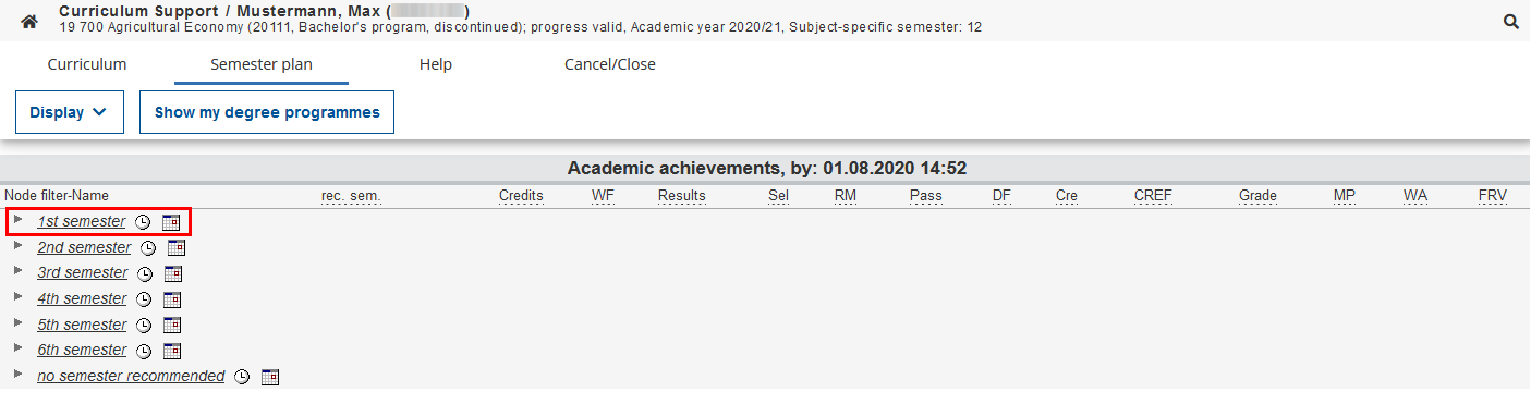 By clicking on the clock icon you can view a list of recommended courses for a subject-specific semester. You also have different options to filter the displayed list of courses.