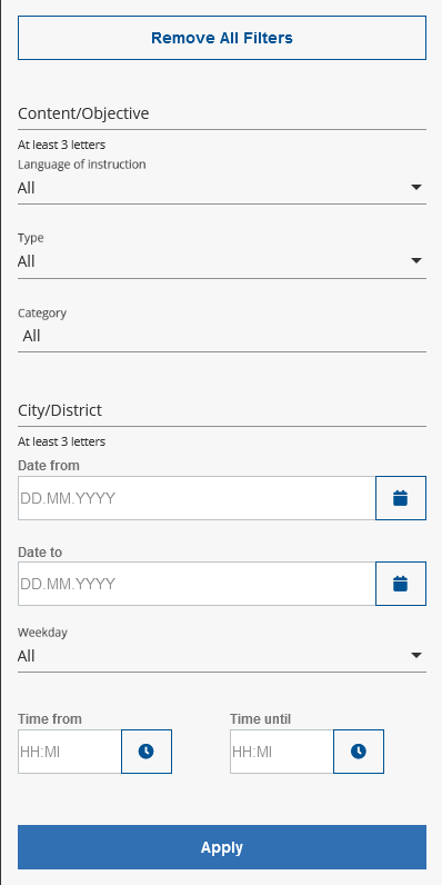 By clicking on the "Filter" button you can also filter the list of courses by keywords in the content description, language of instruction, course type or courses that are held at a certain place, within a certain date range or regularly on a certain week day or within a certain period of time.