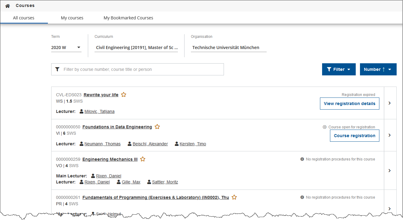 Open the application "Courses" on your desktop. All courses offered at TU Munich in the current semester will be displayed. You can change the semester or filter by a certain organization.