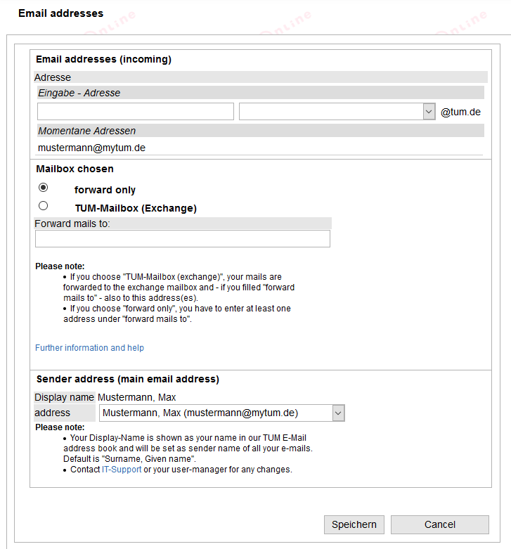 In the application “E-mail Adresses” the window “Email addresses (incoming)” opens. Here you can set up your TUM e-mail address and select your mailbox.