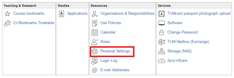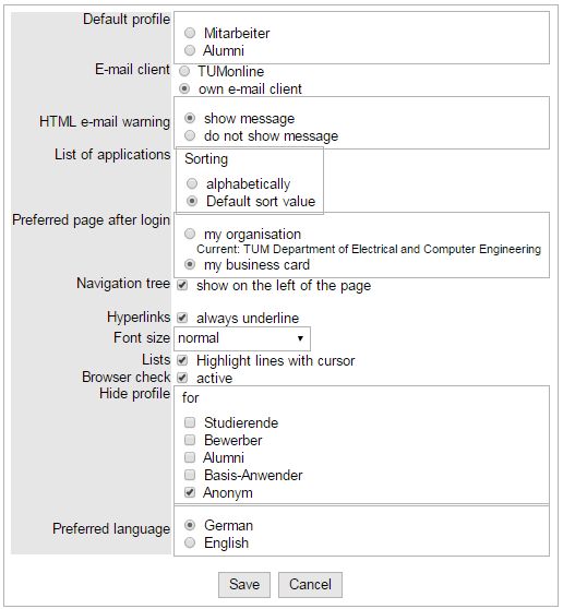 You can configure whether your TUMonline is to be displayed in German or English via “Preferred Language”.