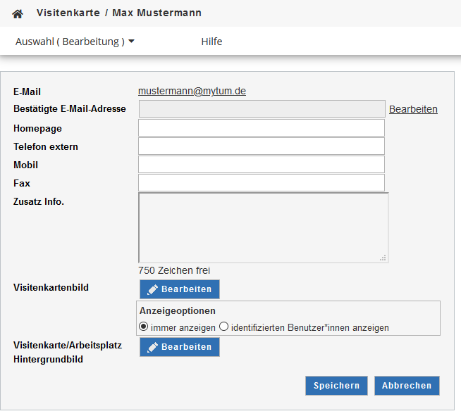 „Visitenkartenbild“ | Hier können Sie ein Foto hochladen, das auf Ihrer Visitenkarte erscheinen soll. Klicken Sie dazu auf den Button „Bearbeiten“. Klicken Sie auf „Durchsuchen“, um ein bereits auf Ihrem Rechner gespeichertes Bild auszuwählen. Das Bild sollte entsprechend den Angaben rechts formatiert sein. Unter „Anzeigeoptionen“ können Sie zusätzlich wählen, ob das Bild allen Nutzern * Nutzerinnen oder nur identifizierten (angemeldeten) TUMonline-Nutzern * Nutzerinnen angezeigt werden soll. |