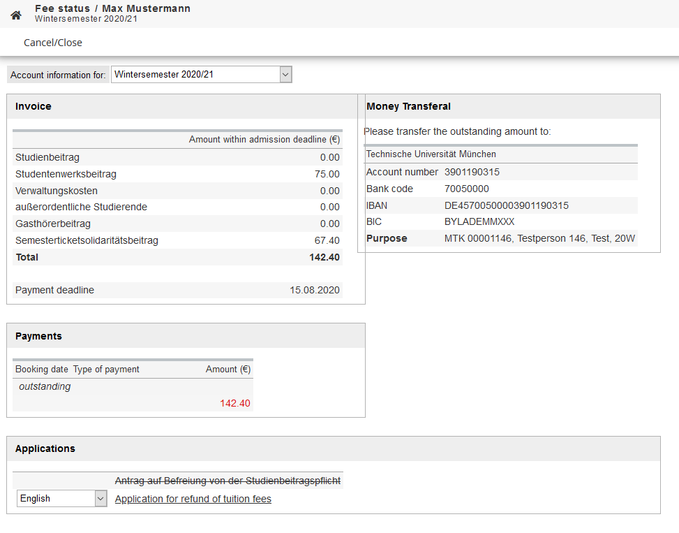 The page with your tuition fee details (your tuition fee account) opens. You can change the semester for which you want to view the tuition fee status.