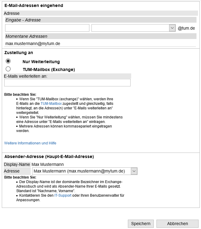 In der Applikation „E-Mail-Adressen“ öffnet sich die Seite „E-Mail-Adressen eingehend“. Hier können Sie Ihre TUM E-Mail-Adresse und die Mailbox wählen: