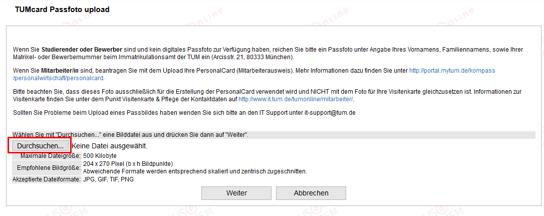 Auf der Seite „TUMcard Passfoto upload“ klicken Sie auf „Durchsuchen...“. Ein Fenster öffnet sich. Navigieren Sie zu dem Ordner, in dem Ihr Foto gespeichert ist und wählen Sie es aus. Bitte beachten Sie die Vorgaben zu Bildgröße und Dateiformat.
