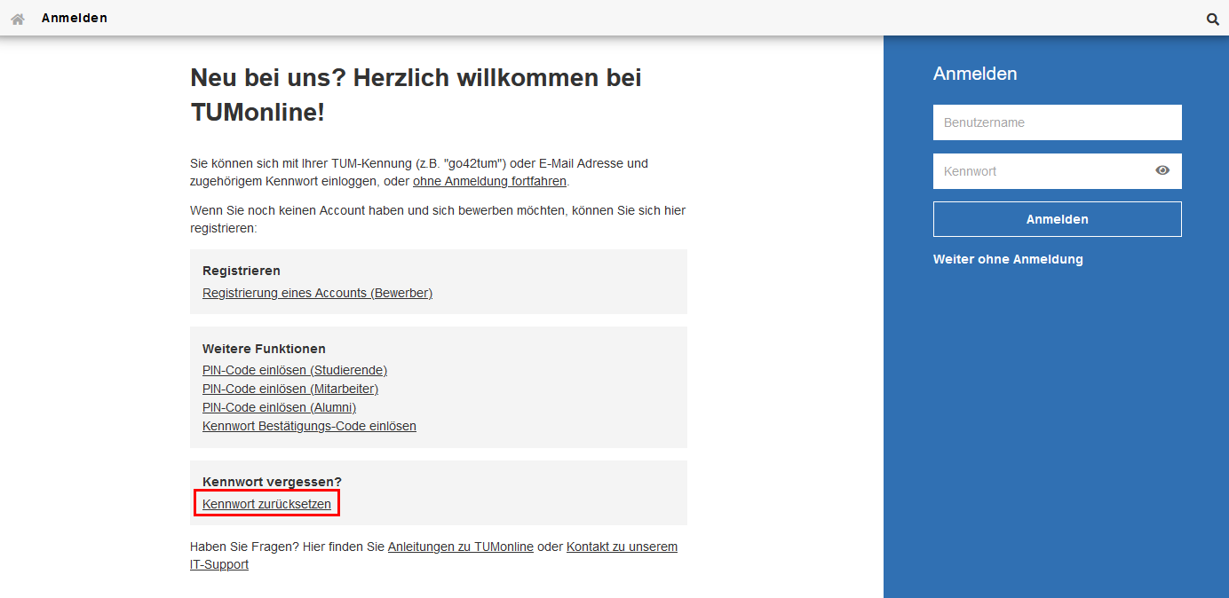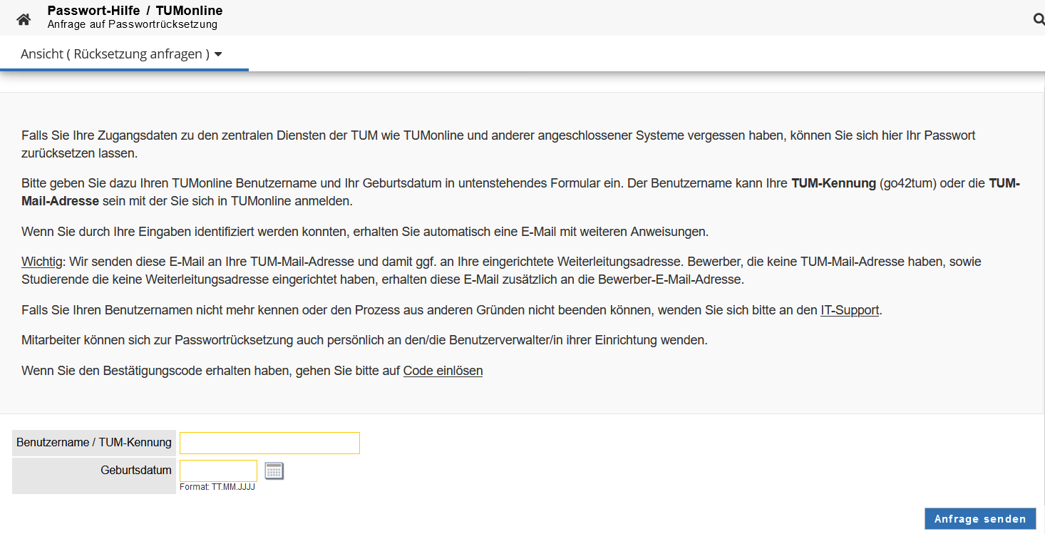 Mit Klick auf den Link „Kennwort zurücksetzen“ öffnet sich die Seite „Passwort-Hilfe / TUMonline“: