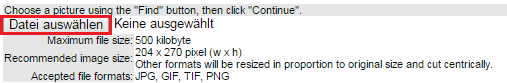 A new window opens up. Click on „Datei auswählen/Find“ to choose a photo. Navigate to the folder where the photo is saved and choose the photo. Make sure the photo has the right size.