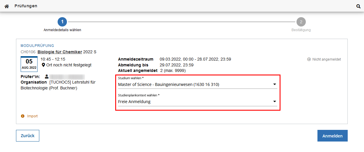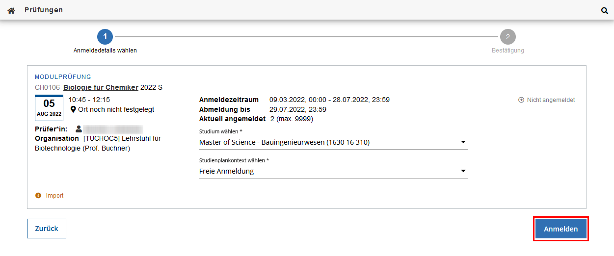 Erst nach der Zuordnung zu Ihrem Studienplan wird der Anmelde-Button aktiviert.