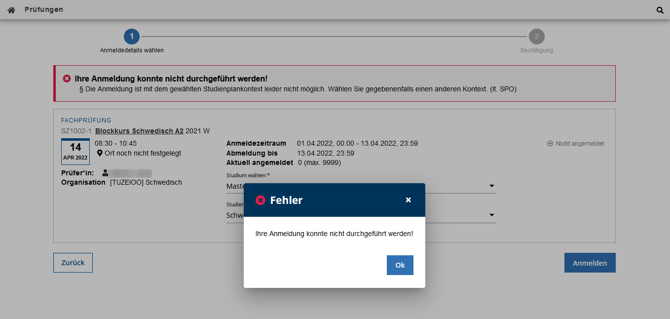 Gründe und weitere Informationen zu den folgenden Schritten entnehmen Sie den Informationsfeld „Ihre Anmeldung konnte nicht durchgeführt werden!“ und den FAQ: Die Prüfungsanmeldung funktioniert nicht - was kann ich tun?