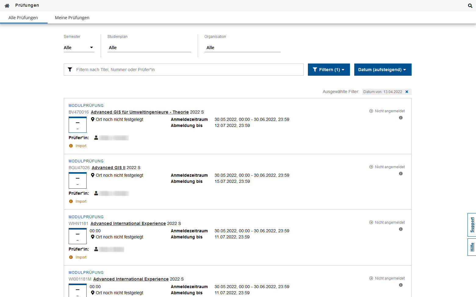 Im Reiter „Alle Prüfungen“ können Sie nach der gewünschten Prüfung suchen.