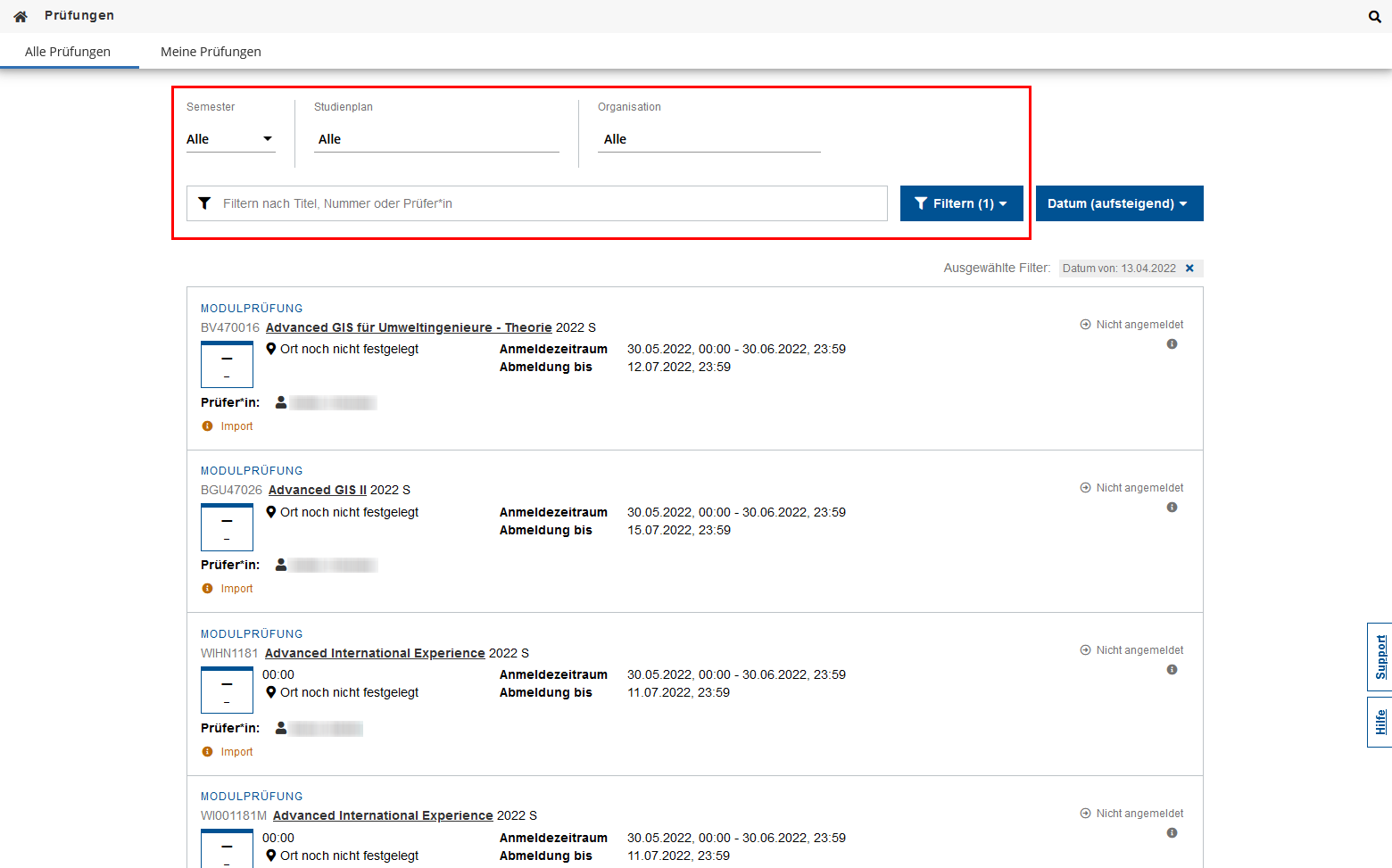 Mithilfe des Filters „Prüfungen zu meinen Modulen (LV teilgenommen, Prüfung noch ausständig, Modul noch nicht positiv)“ können Sie nach Prüfungsterminen zu Modulen filtern, in denen Sie LVs belegt haben.