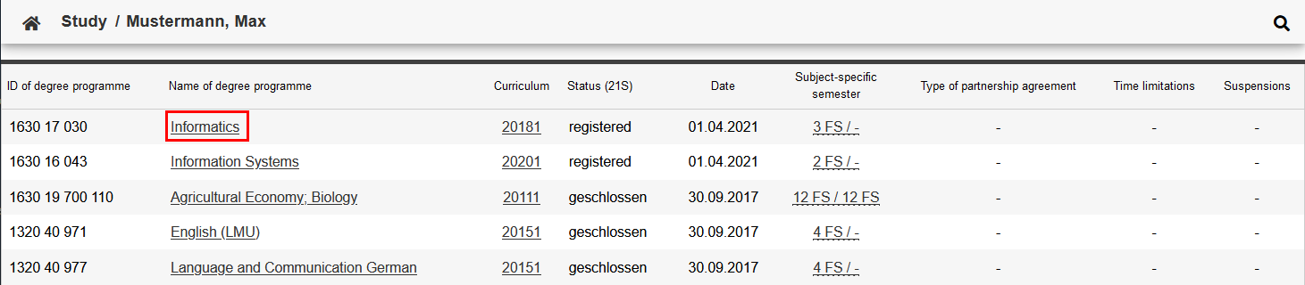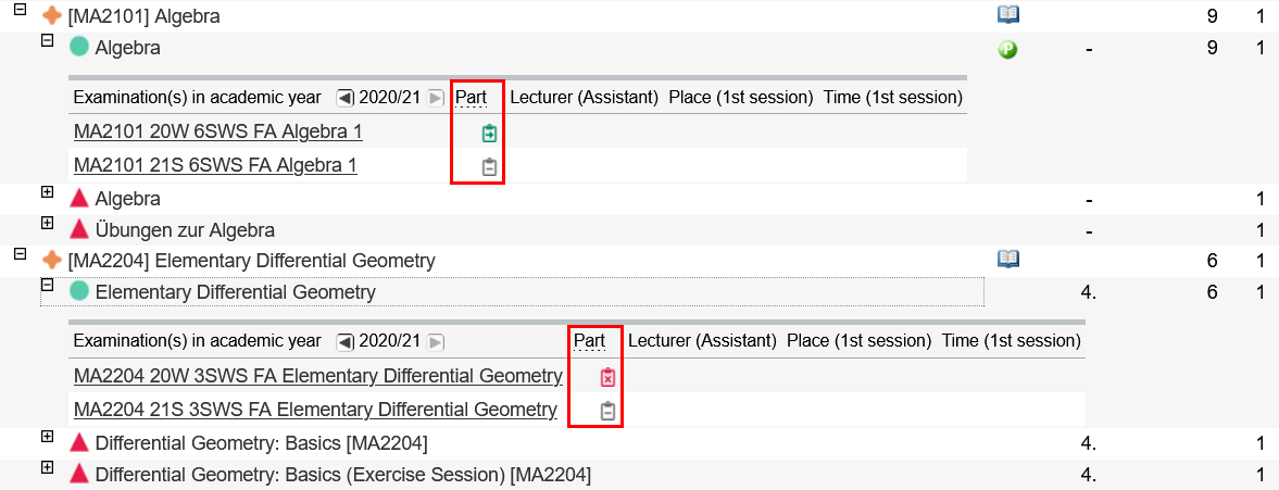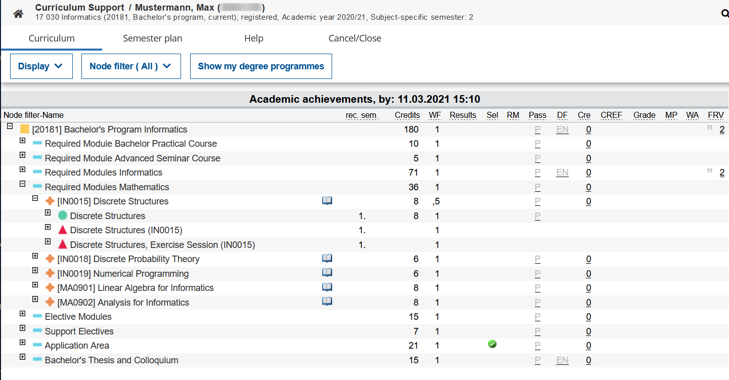 In the “Curriculum Support” your curriculum will then be displayed in a tree-like structure (= curriculum tree) showing all modules, courses and exams.