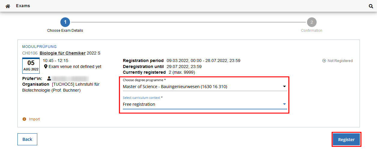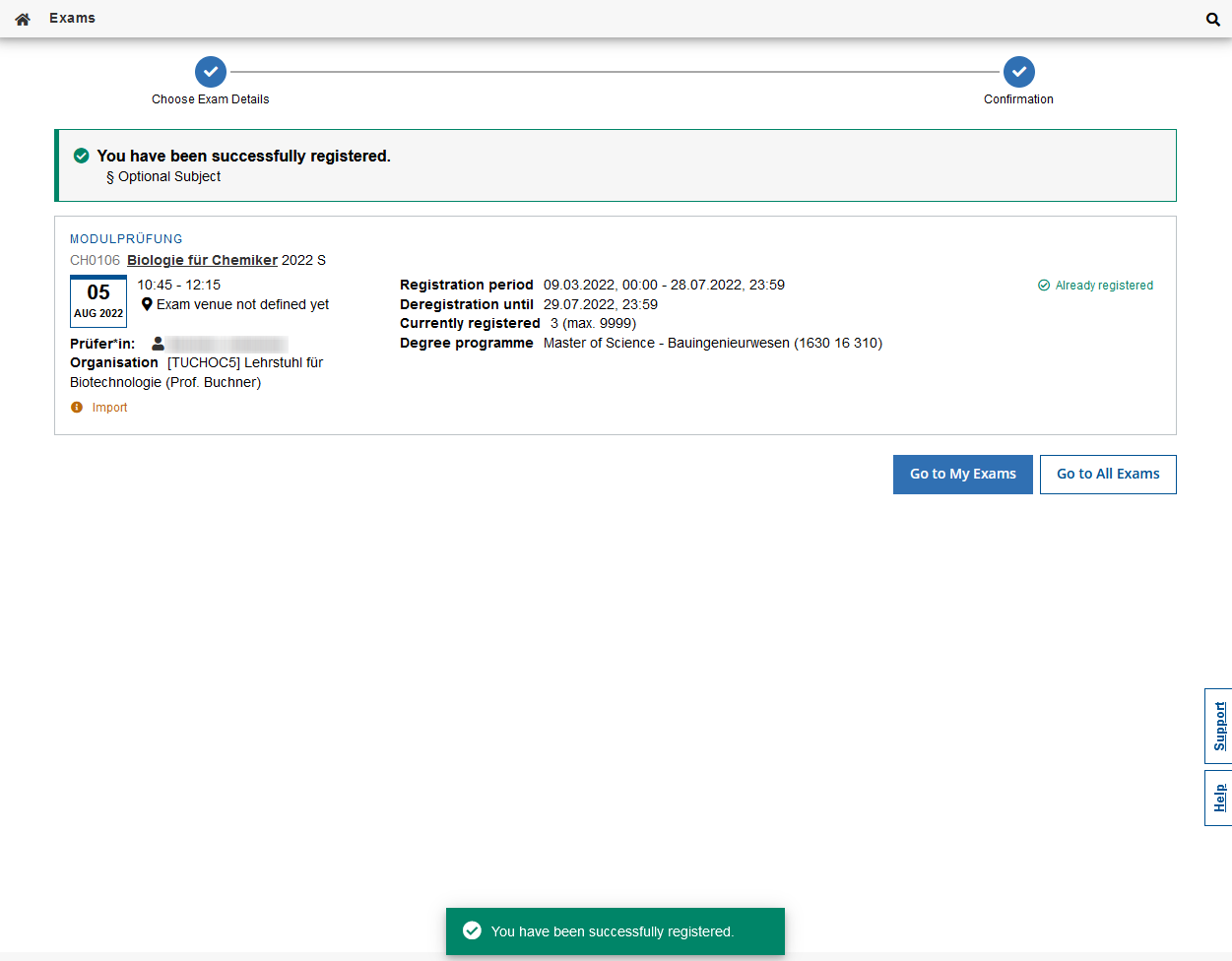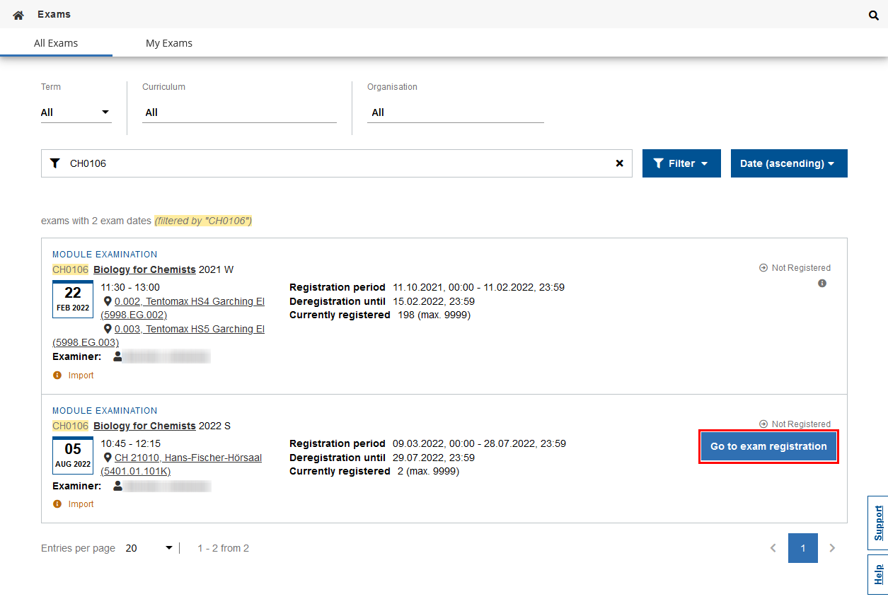 If the registration for the exam is currently possible, you will find the “Go to exam registration” button next to the exam date.