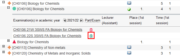 Click on the green icon in the application “Study Status / Curriculum” in order to register for an exam.