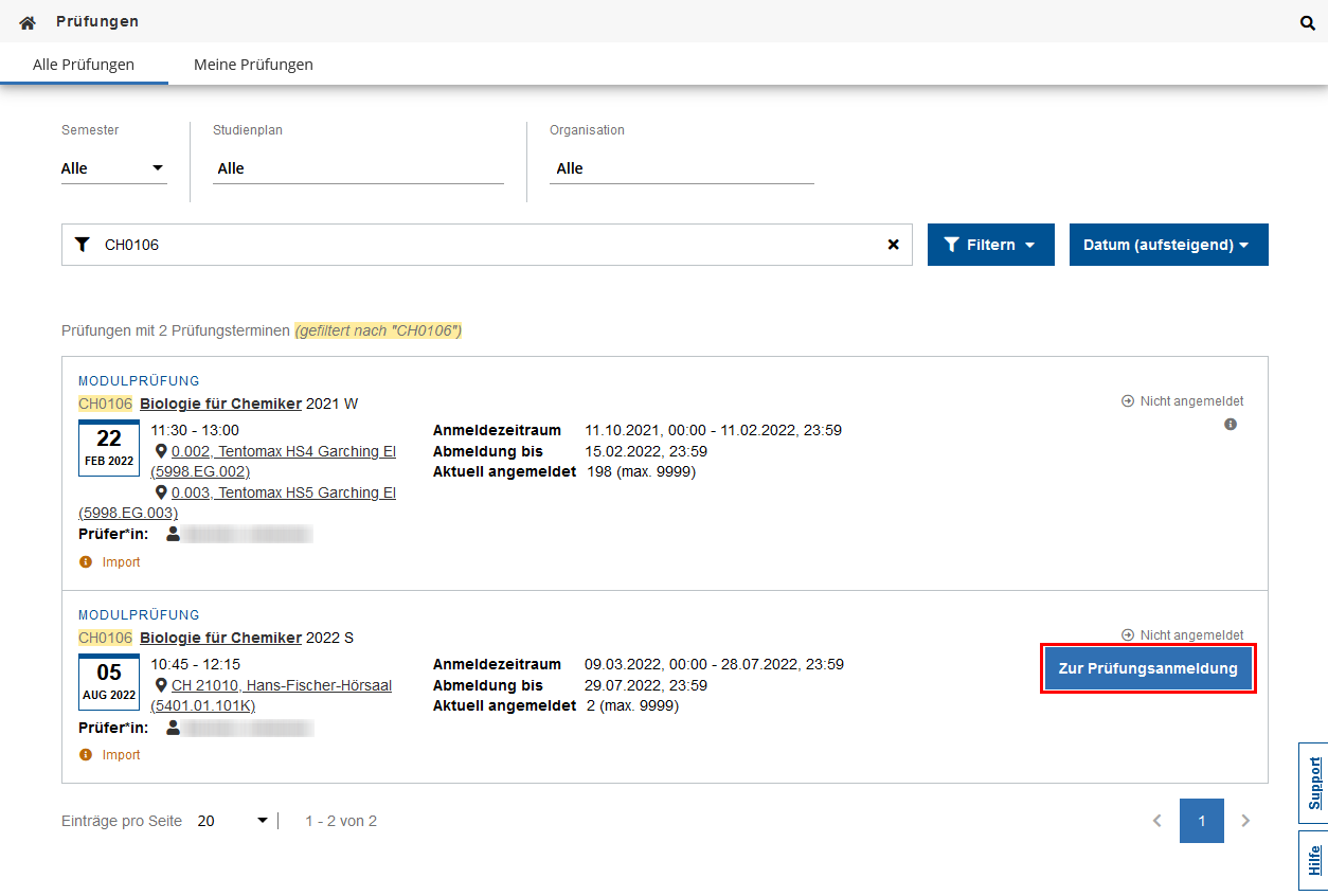 Suchen Sie nach der betreffenden Prüfung und klicken Sie auf den Button „Zur Prüfungsanmeldung“: