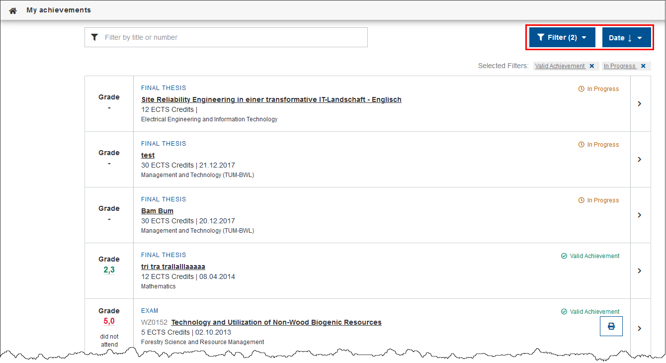 By default, the achievements are sorted descending by date and - in the case of several degree programs - not sorted by the degree program they were obtained in.