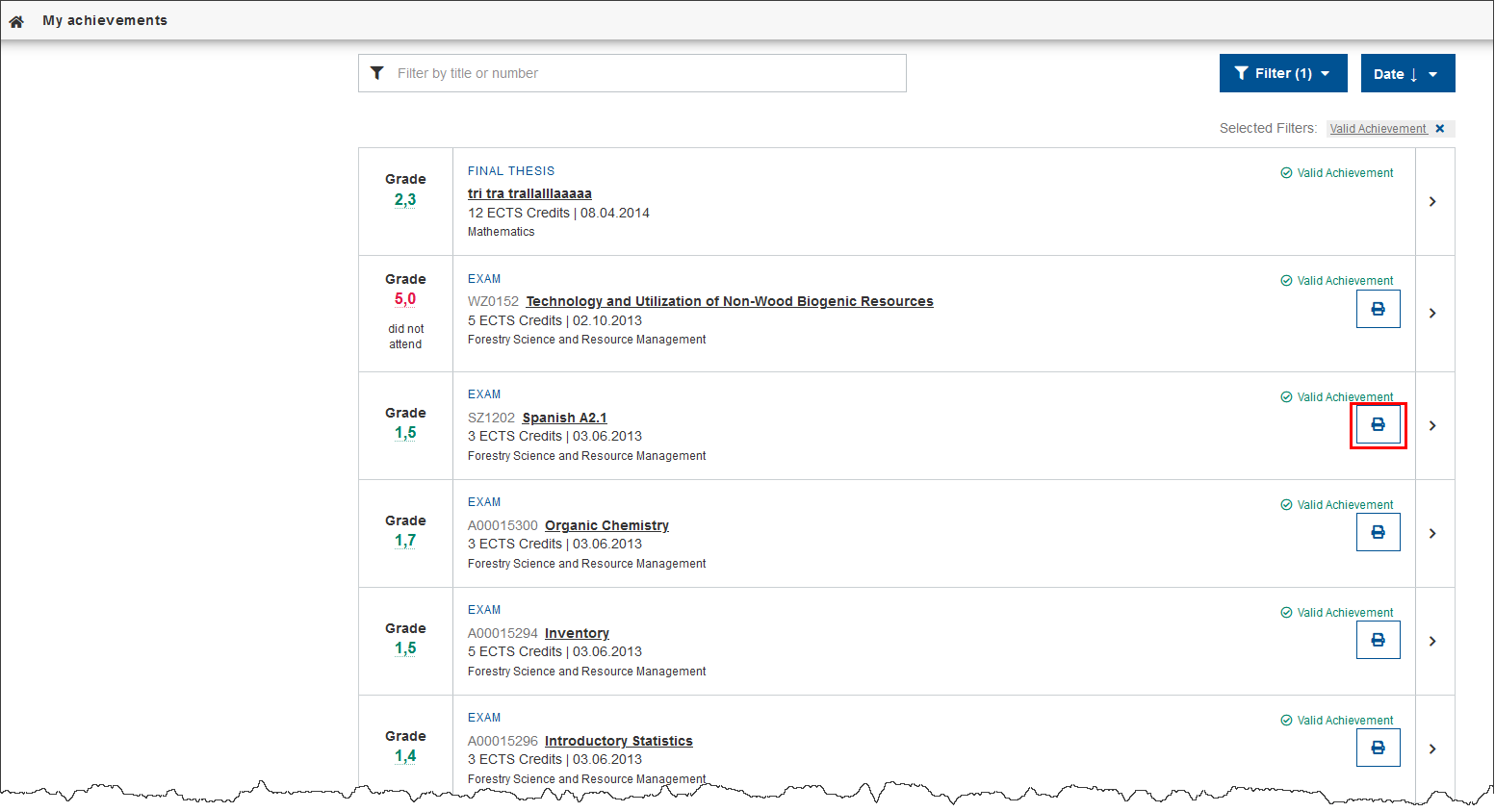 Click on the print icon of a valid achievement in the application “My Achievements”.